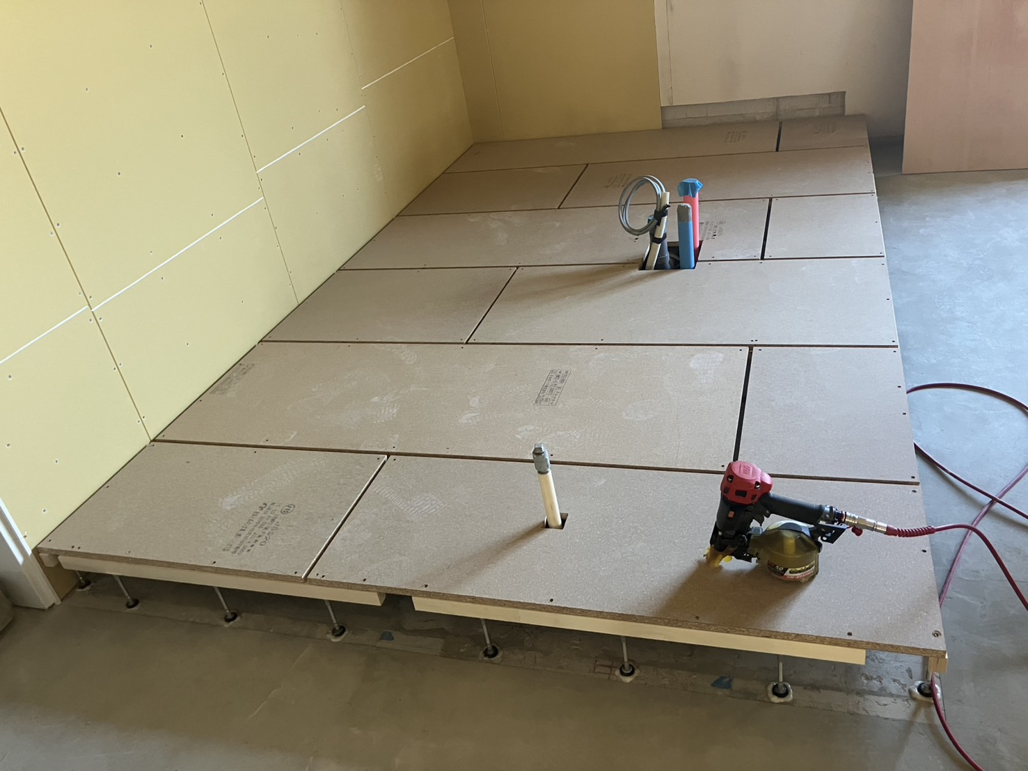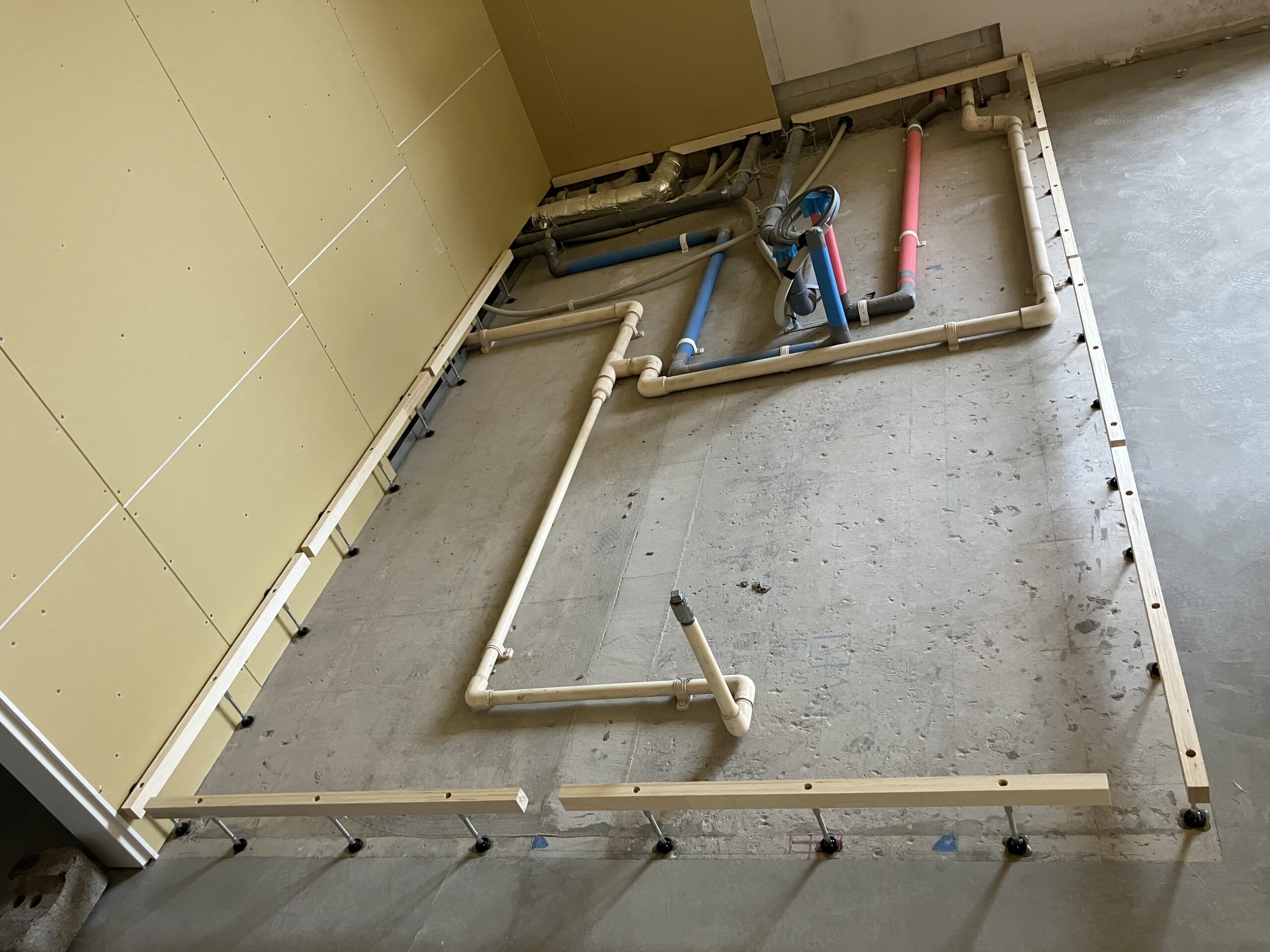 | 施工内容 | 今回のご相談は、マンションの一部空間を活かし、使い勝手とデザイン性を両立した小上がりスペースをつくりたいというものでした。 そこで、既存のコンクリート床の上に置床工法を採用し、小上がり仕様の床を新設しました。 配管や設備が集中するエリアのため、床下に十分な空間を確保できる置床工法とし、支持脚によるレベル調整を行いながら、将来のメンテナンス性にも配慮した施工としています。 また、配管位置を確認しながら下地を組むことで、無理のない納まりと安定した床構造を実現しました。 【置床工法・小上がりのメリット】 ・配管対応がしやすい:床下空間を確保でき、設備更新や点検にも柔軟に対応 ・段差を活かした空間演出:小上がりにすることで、空間にメリハリと用途の幅が生まれます ・レベル調整が可能:既存床の不陸を調整し、安定した仕上がりに 施工では、下地材の固定・割付にも注意し、床鳴りや沈み込みが起きにくい構造としました。仕上げ材施工を前提とした精度管理を行い、見えない部分こそ丁寧に仕上げています。 「限られた空間を有効活用したい」「配管のある場所でも小上がりをつくりたい」といったご要望にも、現地状況に合わせた最適な工法をご提案いたします。 公民館特有の制約を踏まえた施工も、ぜひお気軽にご相談ください。 |