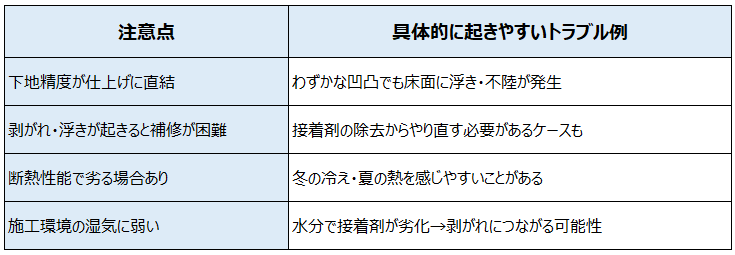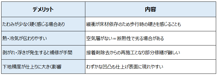 直貼りは床下に空間がないため通気・逃げ場が確保されにくく、湿気環境に影響を受けやすい点は特に注意が必要です。