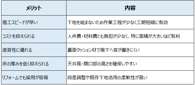 直貼り工法には、施工性の高さや遮音性能など多くのメリットがあり、工期短縮やコスト抑制にもつながる実用性の高い床仕上げ方法です。
