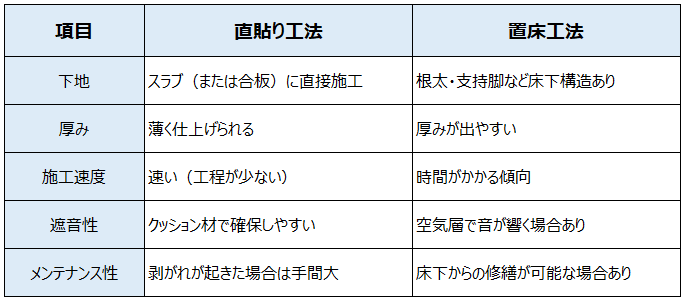 直貼り工法は、施工性や遮音性に優れた一方で、下地処理や環境条件によって仕上がりが変わる工法のため、建物に合わせた適切な判断が重要になります。