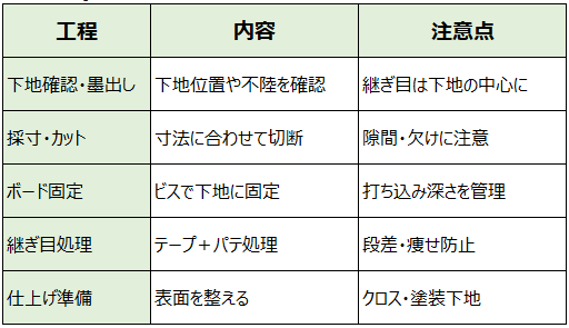 ボード工事は、決められた手順を正確に行うことで品質が確保されます。