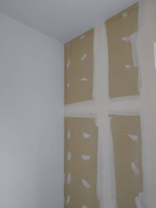 クロスを貼る前の壁面(石膏ボードなど)には、ボード同士の「継ぎ目(ジョイント)」や「ビス頭の窪み」が必ず存在します。クロスは非常に薄い素材であるため、そのまま貼ってしまうと、乾燥・密着した際にそれらの凹凸が表面に浮き出てしまいます。 特に、夜間に間接照明を灯した際や、窓から斜めに日光が差し込んだ際に、下地処理が甘いと壁面にシワや段差のような影が目立ち、仕上がりの質を下げてしまいます。