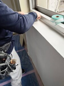 古いクロスを剥がすスクレーパーや、パテを削るやすりを使い、手で触れても段差を感じないほどフラットな状態に整えます。この徹底した下地作りが、クロスを貼った後の美しさを支えています。